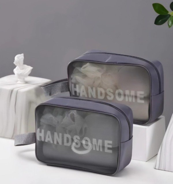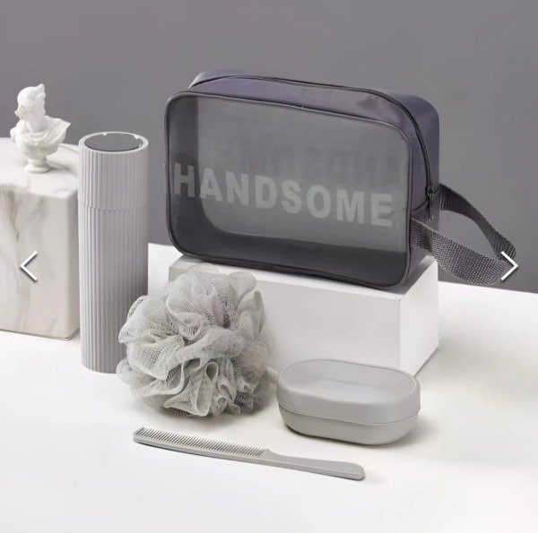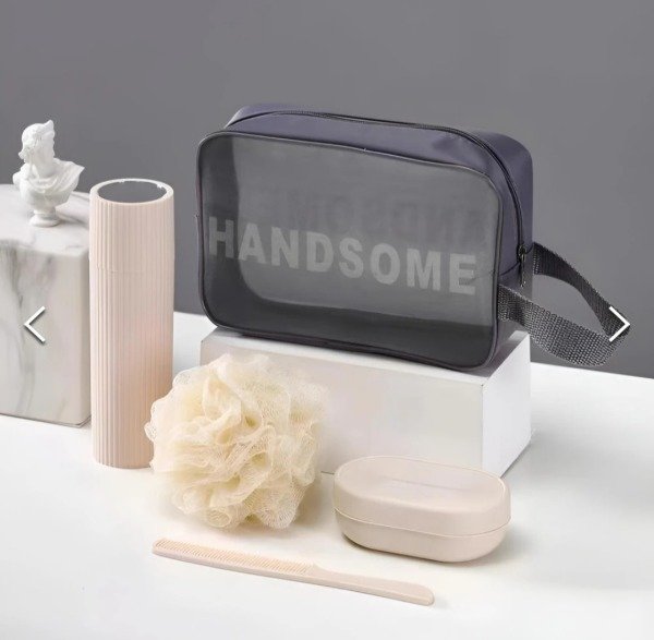 Neceser de viaje con accesorios de baño. Este tipo de kit es ideal para llevar productos de higiene personal de forma organizada. Incluye un neceser transparente, un estuche para cepillo de dientes y pasta, un peine, una jabonera y una esponja de baño. Perfecto para viajes, gimnasio o para mantener los artículos de tocador ordenados en casa. El neceser transparente permite ver fácilmente el contenido, mientras que los accesorios son de plástico resistente